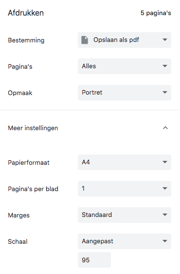 Deze printfunctie en het kunnen opslaan als PDF zijn in dit geval afhankelijk van de instellingen van de gebruikte internetbrowser en computer en vallen buiten de controle van Sonnio. In een aantal gevallen zorgt hierbij het instellen van de afdrukschaal kleiner dan de standaard ingestelde 100% voor een beter passende afdruk en/of PDF.