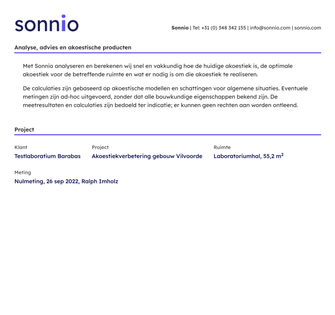 Een kenmerk van Sonnio is dat akoestiek en alle aanpassingen daarvan door het toepassen van akoestische producten en materialen, in realtime zichtbaar (en hoorbaar gemaakt wordt. Dit vergemakkelijkt het maken van keuzes hierin.