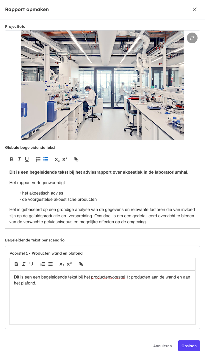 In Sonnio kunnen diverse combinaties van akoestische producten en/of materialen gemakkelijk in scenario's worden opgeslagen. Indien er met Sonnio voor de akoestiek van een ruimte meerdere scenario's gemaakt zijn, worden deze ook zo in het PDF rapport verwerkt.