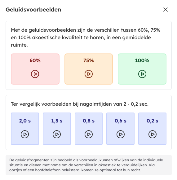 Rechtsboven wordt via de knop Toon geluidsvoorbeelden op het verbeteradvies, een keuzescherm getoond met een aantal algemene voorbeelden van hoediverse nagalmtijden in een ruimte klinken.