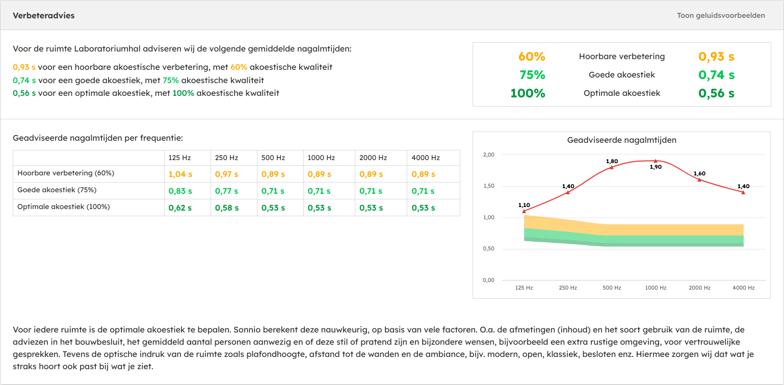 In het onderdeel Verbeteradvies wordt door Sonio Pro automatisch berekend wat de geadviseerde (betere) akoestiek voor de betreffende ruimte is.