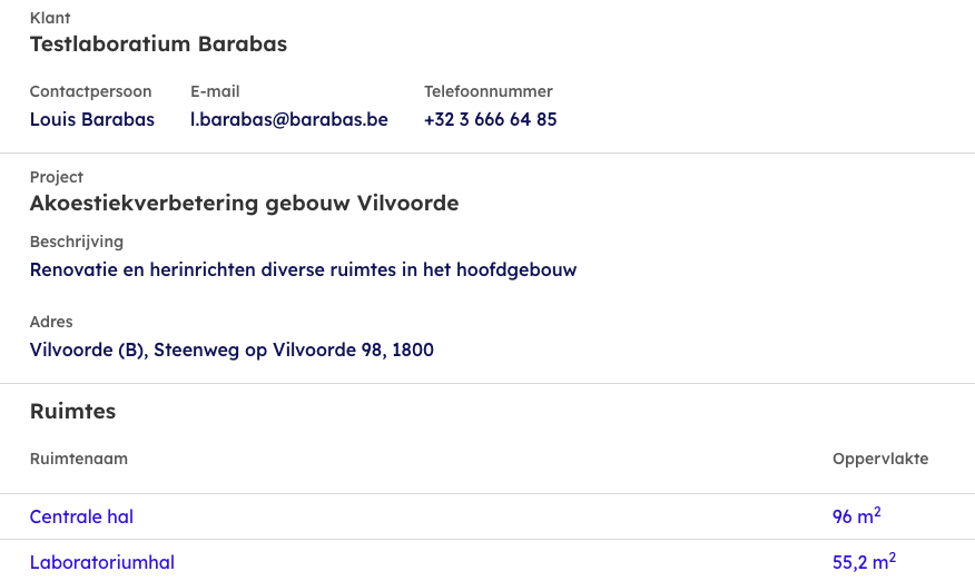 In dit voorbeeld: Klant: Testlaboratorium Barabas Project, behorende bij de klant: Akoestiekverbetering gebouw Vilvoorde Ruimtes, behorende bij het project: Centrale hal en Laboratoruimhal